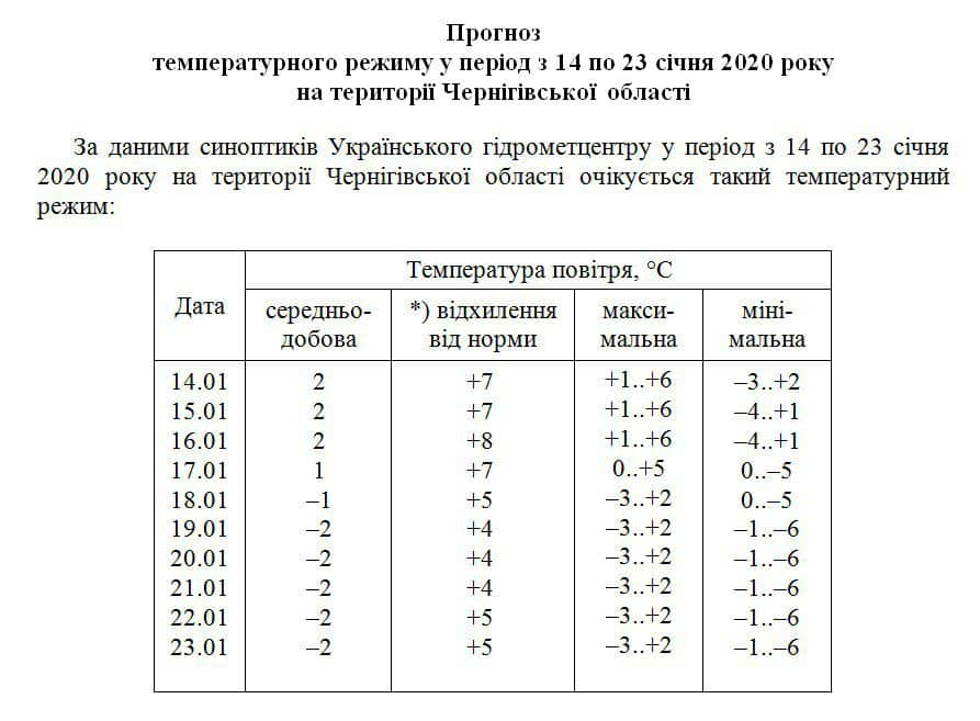 Синоптики прогнозують, що починаючи з 18 січня, на Чернігівщині середньодобова температура повітря стане мінусовою та буде коливатись в межах від -1 до -2 градусів.
