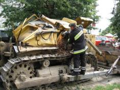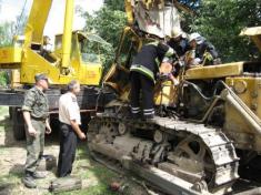 Перевернуть и опять поставить трактор на гусеницы удалось с помощью двух мощных автокранов и грузового автомобиля "КрАЗ". Потом спасатели с помощью специнструмента разрезали раздавленную кабину и достали тело тракториста. Одновременно с этим, во избежание загорания разлитой солярки, было проведено развертывание оборудования от пожарной автоцистерны.