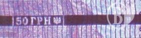 3. Защитная кодируемая лента. Это полностью погружённая в толщу бумаги полимерная кодируемая лента, на которой размещены прозрачные изображения в прямом и перевёрнутом виде, например: у банкнот номиналом 50, 100, 200 и 500 грн. - это „50 ГРН" („100 ГРН", „200 ГРН" и „500 ГРН" соответственно), тризуб и подчёркнутое цифровое обозначение номинала („50", „100" и т. д. ). Это же касается и 20-гривневых купюр, но цифровое обозначение номинала „20" размещено в две строки.