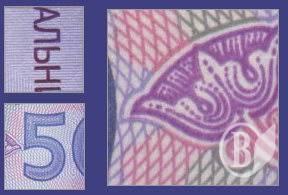 6. Сквозной элемент (совмещённое изображение). Это изображения, которые выполнены в одном месте на лицевой и обратной сторонах банкнот, во время рассматривания которых против света с лицевой стороны купюры проглядывают буква „В" в 20-ах, 50-ах и 100-ях, а также цифровое обозначение номинала „200" но „500" у соответствующих банкнот.