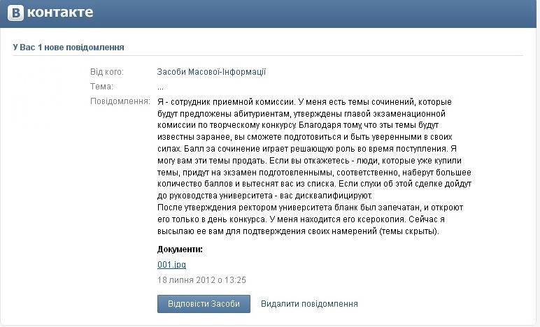 Буквально декілька днів тому мені приходить повідомлення ВКонтакте від користувача «Засоби Масової Інформації». Він представляється як співробітник приймальної комісії цього ВУЗу та пропонує мені угоду – я купую у нього список тем на творчий конкурс, але про це нікому не кажу, бо дискваліфікують.