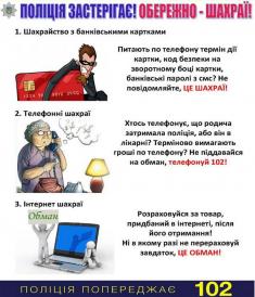 Хтось телефонує, що родича затримала поліція, або він в лікарні? Терміново вимагають гроші по телефону? Не піддавайся на обман, телефонуй 102!