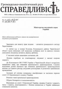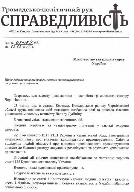 Заступник лідера Руху Валентина Наливайченка «Справедливість» Руслан Колєсніков звернувся з листом до Міністерства внутрішніх справ України з наполяганням забезпечити неупереджене та всебічне досудове розслідування справи Данила Дубініна, якого 21 квітня цього року викрали та побили молодики спортивної статури в Козельці на Чернігівщині.