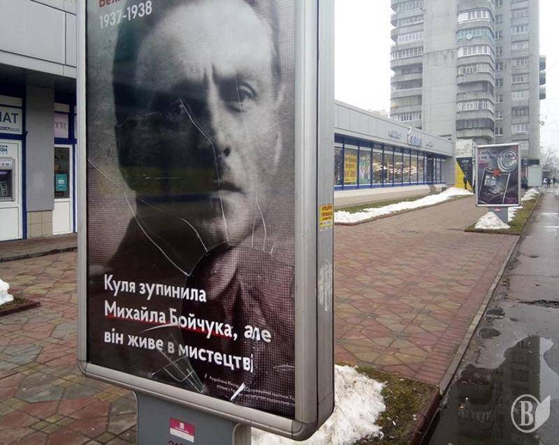 «Ще один постріл у серце художника, розстріляного сталінським режимом – Михайла Бойчука, – так описав цей злочин громадський діяч Олександр Ясенчук. – Невідомі криси, розтрощили сіті-лайт з його зображенням, причому всі інші сіті-лайти з комерційною рекламою залишились неушкодженими».