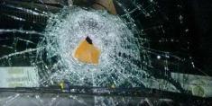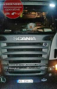 А дісталося тягачу Scania із сербськими номерами. Дістався йому шмат цегли в лобове скло.