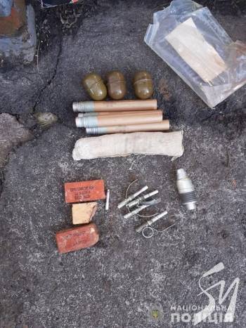 Під час обшуку поліцейські виявили прихованими у дворі та в господарських будівлях три ручні гранати РГД-5, чимало запалів до ручних гранат, чотири реактивні освітлювальні патрони, постріл до підствольного гранатомета, тротилові шашки сумарною вагою близько 500 грамів, півкілограмовий пороховий заряд, набої до нарізної зброї армійських зразків.