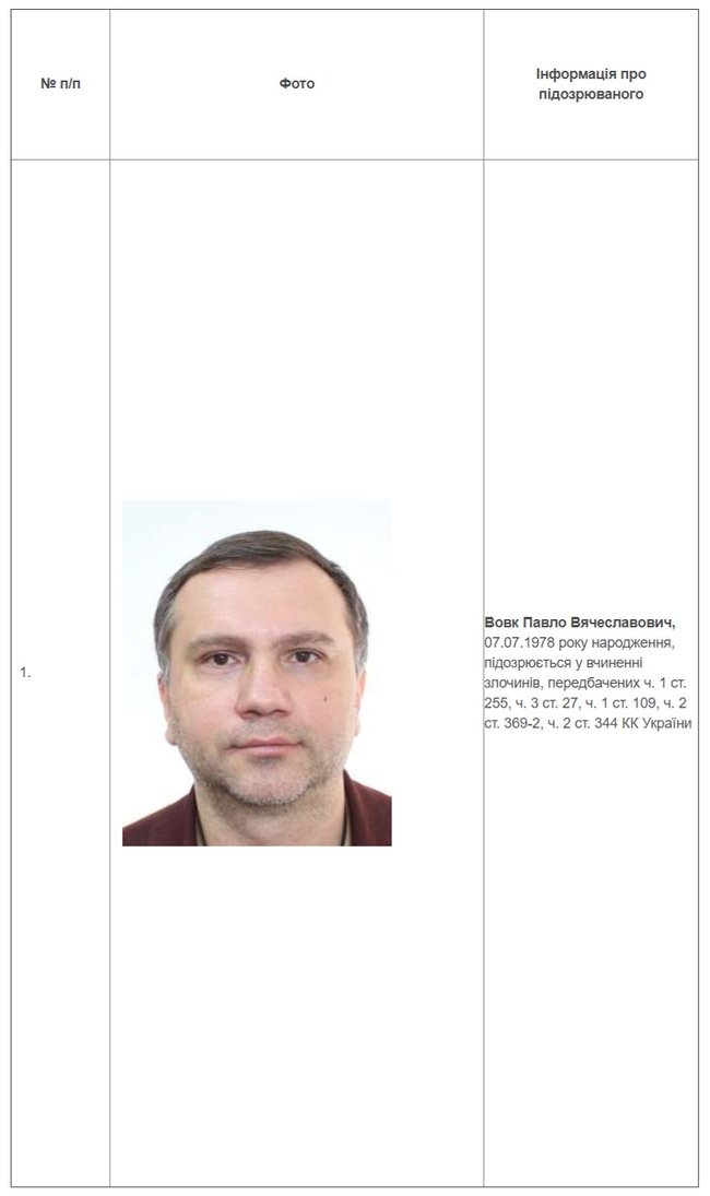 В інформації про підозрюваного вказується: "Вовк Павло В'ячеславович, 07.07.1978 року народження, підозрюється в скоєнні злочинів, передбачених ч. 1 ст. 255, ч. 3 ст. 27 ч. 1 ст. 109, ч. 2 ст. 369- 2, ч. 2 ст. 344 КК України".
