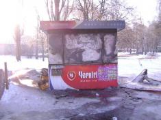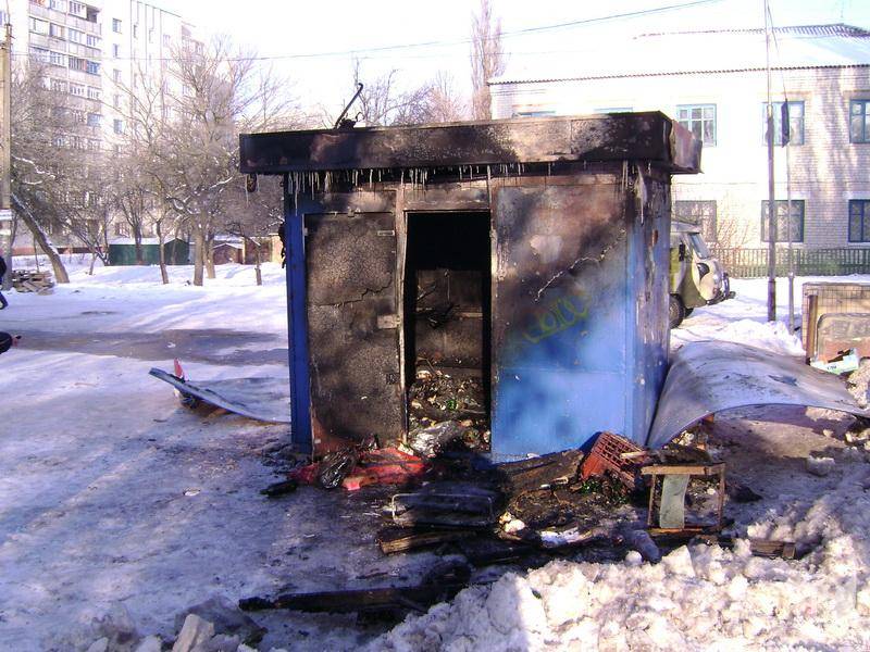 Вдень біля згорілого кіоску були помічені місцеві п’яниці-мародери, які витягували звідти напівобгорілі продукти та пляшки.