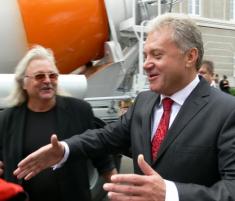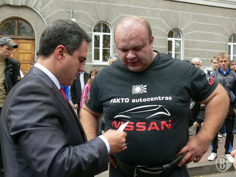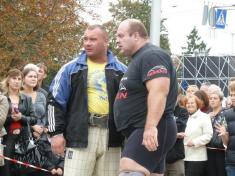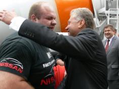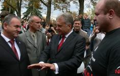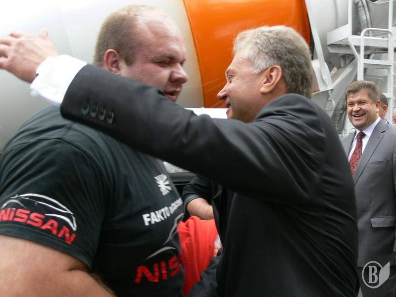 Мер Чернігова Олександр Соколов знайомить міського голову Гомеля з чернігівським силачем Олександром Пекановим