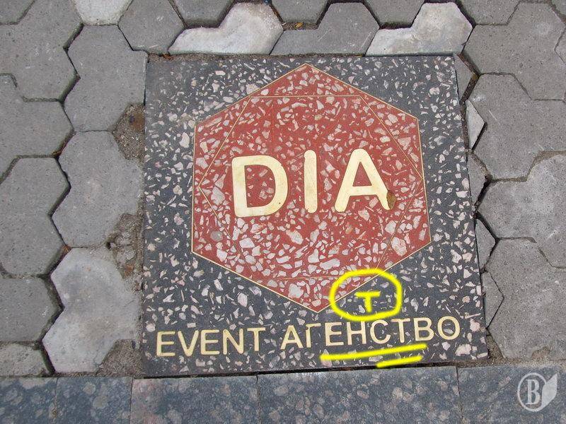 Особливо яскраві, навіть феєричні почуття викликає п'ята плита. Та, на якій не п'ятикутня зірка, а шестикутник з трьома літерами «DIA». Плита грубо врізана у тротуарну плитку, котра має зовсім не підходящу для вставки квадратних плит чудернацьку 12-кутну форму. Плита ще й вгрузла нижче рівня бруківки.