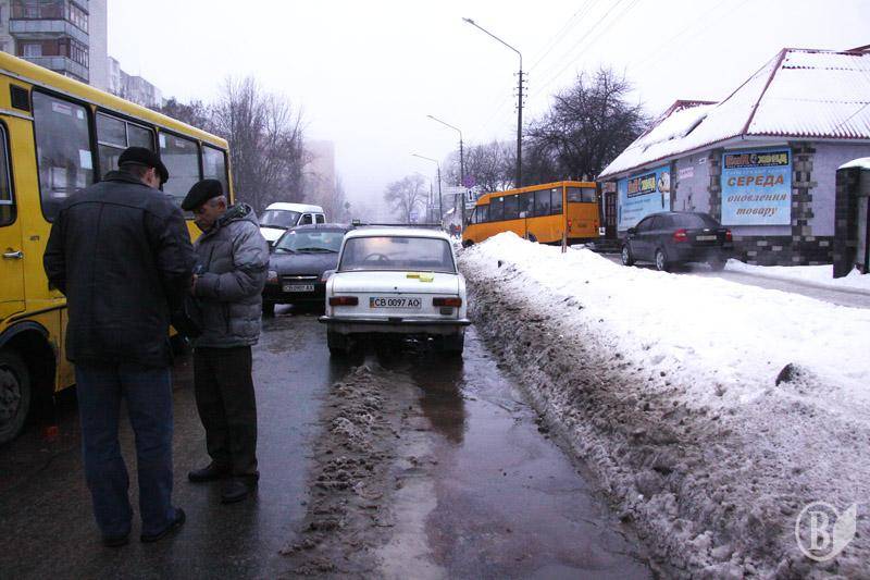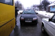 Поцілунок чорненького з біленьким був щирим та логічним. Від нього Шеврове трішечки занесло – сталося напевно помутніння. А ось «повільний» 31 автобус не встиг загальмувати і прочертив бочком по чорненькій машинці.