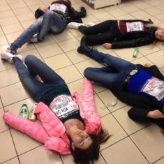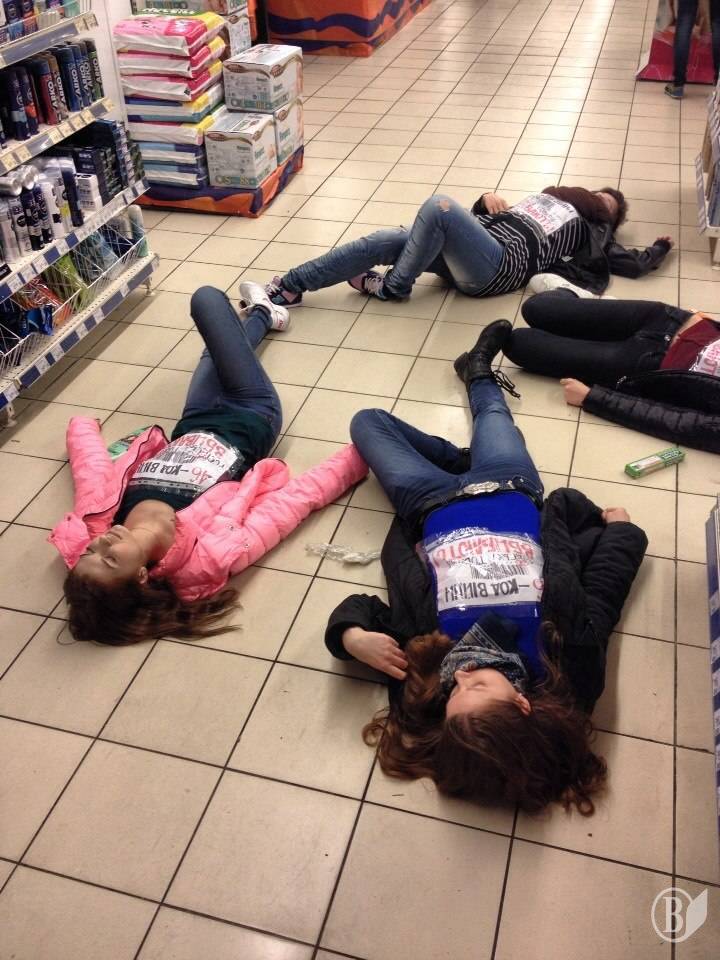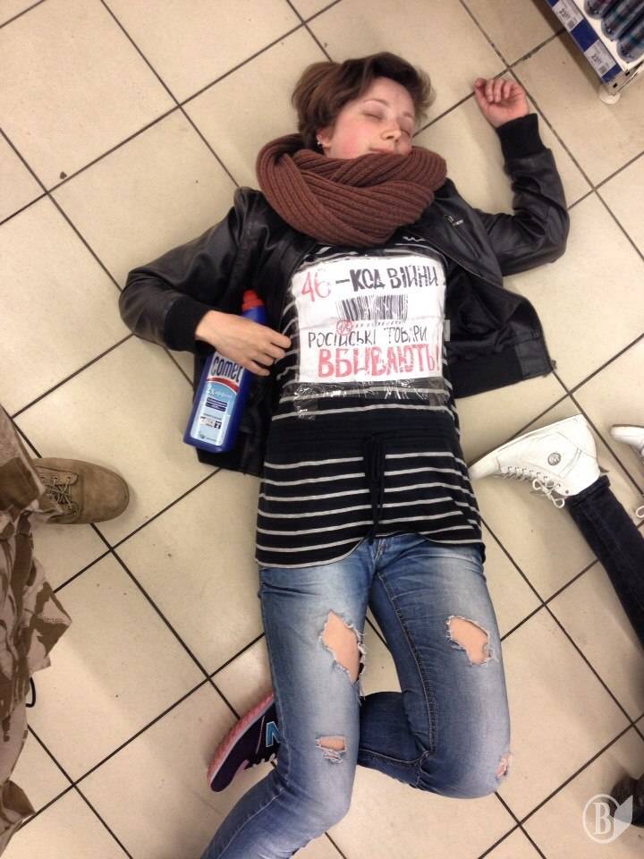 Несколько молодых девушек с прикрепленными поверх одежды плакатами, что содержали надписи «46 – код войны. Российские товары убивают!» падали на пол торгового зала, демонстрируя таким образом, свой протест против политики России в отношении Украины.