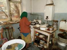 Утром 20 марта журналисты прикупив провизии, отправились проведать пожилую женщину. Как и говорила читательница Ольга, пошли под окна Марии Ивановны. Шел дождь, бабушка действительно сидела у окна как одуванчик, вглядываясь в наши лица. Приняв нас за школьников, радостно закивала и жестами пригласила в гости. Мы обошли дом, квартира была открытой. На кухне стояла старушка и мирно помешивала ложкой картошку, которая варилась на плите. Рядом на табуретке громоздилась большая алюминиевая миска с замоченной стиркой.