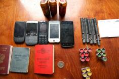 Во время личного досмотра у него было обнаружено: 5 мобильных телефонов, 23 сим-карты, 17 сигнальных ракет и 5 приборов для осуществления пуска этих ракет, 2 военных билета Вооруженных Сил РФ, 3 фотоаппарата, 11 карт памяти для цифрового фотоаппарата, таблица позывных радиосвязи. В блокноте задержанного найден номер мобильного телефона официального лица ФСБ РФ, непосредственного координатора диверсанта.
