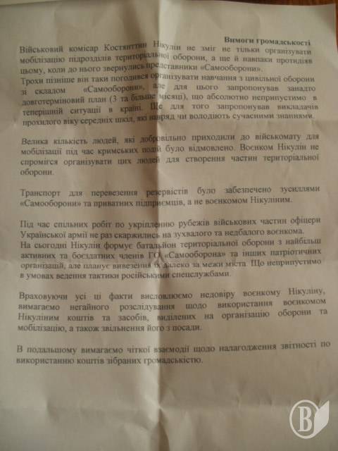 Тож щоб очільник військкомату «не розслаблявся» самообронівці залишили йому "подарунок" – шаблон рапорту на звільнення.