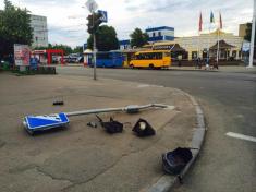 Чорний джип Субару вчора ввечері навпроти МсD не вписався в поворот, зніс знак пішохідного переходу і розтрощив світлофор.