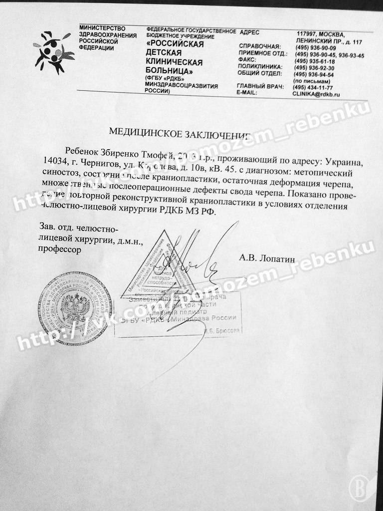 Для граждан Российской Федерации такие операции проводятся безоплатно по квоте, но т.к. мы граждане Украины, то нам был выставлен счет на сумму 568 750 рублей, из них 158 000 рублей(52 245 грн.) – это проведение операции, анестезия, и реабилитация, а 410 750 рублей(135 823 грн.) – это материал для полной реконструкции черепа (саморассасывающиеся пластины).