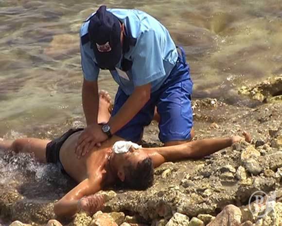 - витягнути потерпілого з води: перш ніж кинутися у воду, потрібно швидко оцінити становище і вибрати спосіб надання допомоги. Іноді, якщо випадок трапився біля берега можна кинути з берега предмет, за який може вхопитися потопаючий: рятівний круг, дошку, мотузку. Якщо поблизу є човен, необхідно використати його. Якщо потопаючий перебуває на поверхні води, то бажано заспокоїти його ще здалека, а якщо це не вдається, то краще доплисти до нього ззаду, щоб уникнути захоплень, від яких часом буває важко звільнитися.