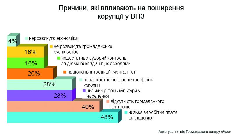 «Относительно причин коррупции среди преподавателей взгляды студентов разделились. 48% опрошенных основной причиной считают низкую заработную плату преподавателей, а 40% говорит, что причина в отсутствии общественного контроля», — говорит руководитель Общественного Центра «ЧАС» Вероника Рыбак.