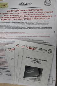 Результати анкетування та фокусних груп обговорено на засіданнях за круглим столом 3-5 грудня. У результаті було підписано Меморандум про взаєморозуміння між студентством, викладачами та адміністративним апаратом 3-х найбільших ВНЗ області. Кожен ВНЗ області отримає цей документ, який буде нагадувати абсолютно всім учасникам навчального процесу про те, що «КОРУПЦІЯ – ЦЕ ЗЛО!».