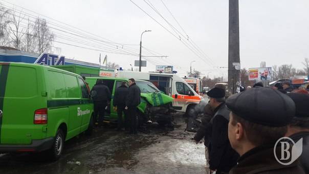Інкасаторів, які перебували в авто, госпіталізували. Ймовірна причина авто - маневри водія інкасаторського автомобіля через порушення правил дорожного руху пішоходом, який вискочив на "червоне світло".