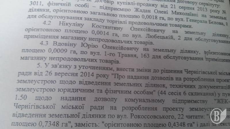 У документі йдеться про 0,0014 гектарів(14 квадратних метрів) по вулиці Любецька, 2 для обслуговування магазину непродовольчих товарів.