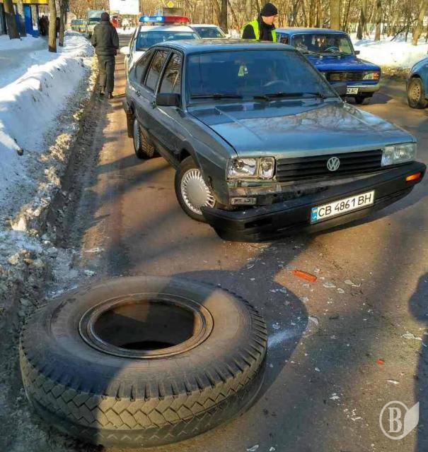 Сталася ДТП близько 11 години на вулиці Любецька неподалік від Єврейського кладовища. Колесо покотилося й пошкодило два легковики Volkswagen Passat.