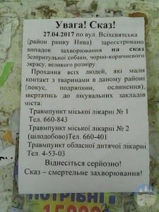 У Чернігові в районі ринку «Нива» поширюються листівки з попередженням про випадок сказу у собаки. За деякими повідомленнями – підозра на сказ.