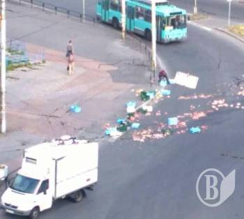 Сьогодні вранці близько 06:50 в районі Кругу з вантажного автомобіля прямо на проїжджу частину випало близько десяти ящиків із м’ясом та м’ясною продукцією.