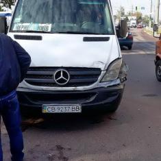 У Чернігові на вул. Козацька не розминулися синій позашляховик і фургон Mercedes Sprinter, яким возять людей маршрутом Чернігів–Київ.