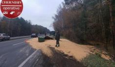 Водій «КамАЗу» нібито їхав з не зовсім справним причепом, через що одне його колесо заклинило і сталося перекидання.