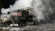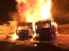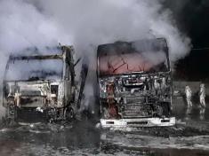 Вогнем знищено 2 вантажних автомобіля з напівпричепами Volvo та DAF і легковик Chevrolet Lacetti. Пошкоджено 80 кв.м покрівлі навісу для автомобілів, тентові покриття напівпричепів двох вантажівок.