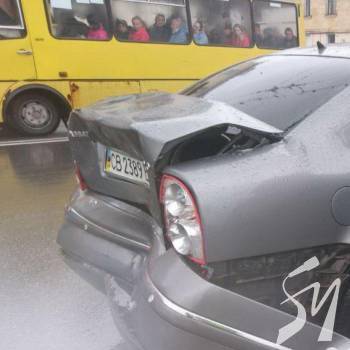 Сьогодні на перехресті проспектів у Чернігові «газелеподібна» іржава маршрутка Рута-20 СПВ вдарила в корму легковик Volkswagen Passat.