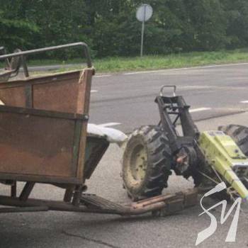 У ДТП є постраждалий і це, очевидно, користувач мотоблоку. Сам той «апарат» від удалу розвалився: його двигун валяється на асфальті окремо.