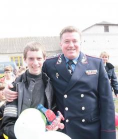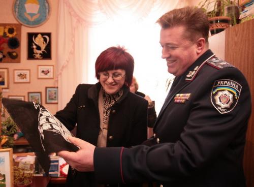 До фото: Заступник начальника департаменту ДАІ генерал-майор міліції Сергій Будник із вихованцем школи-інтернату Олексієм Смолюком, учнем 9-го класу, який любить вишивати. Його роботи представлені на обласному конкурсі «Повір у себе».