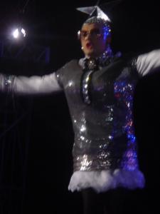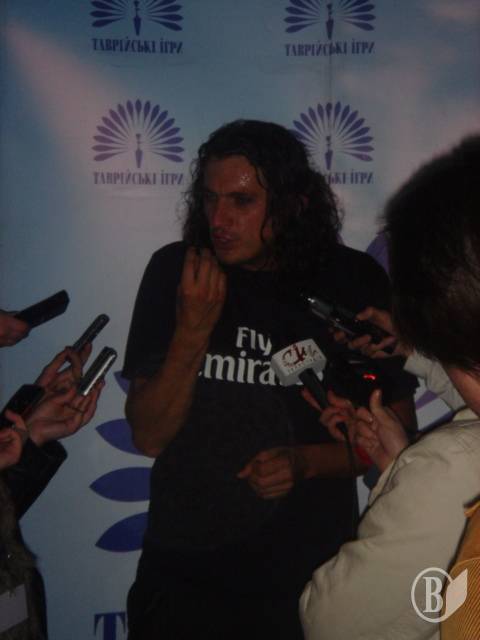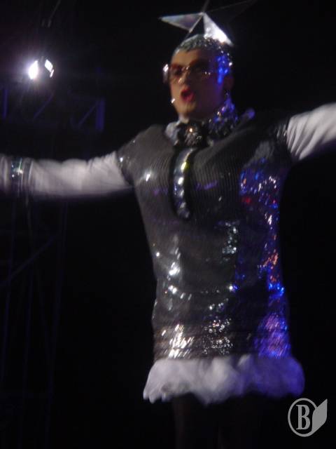 По-настоящему, ярким и очень ожидаемым финалом «альтернативного дня» Таврийских игр стало выступление группы Скрябин. Первое, чем удивил уже легендарный шоу-мен Кузьма – внешним видом, подкрашены глаза и огромные от пояса джинсовые юбочные штаны. Как это всегда бывает в последнее время, шоу делает балет, но это никак не значит, что сами музыканты выглядели хуже. Балет «Любовники», как утверждает Кузьма: «Протащился с них еще на Шансе», в составе балета черниговец Олег Задера, ему, бедняге пришлось побегать и в юбке, и в противогазе, но что не сделаешь ради искусства! В конце шоу Кузьма продемонстрировал то, вокруг чего продолжались сплетни уже достаточно давно, – группа «Поющие трусы».