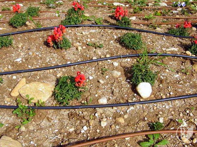 Чтобы оценить усилия его создателей, обратите внимание на фото: каждый цветок получает индивидуальный капельный полив, - дырочка в поливальном шланге точно напротив цветка. Иначе не пережить 9-месячного знойного лета.
