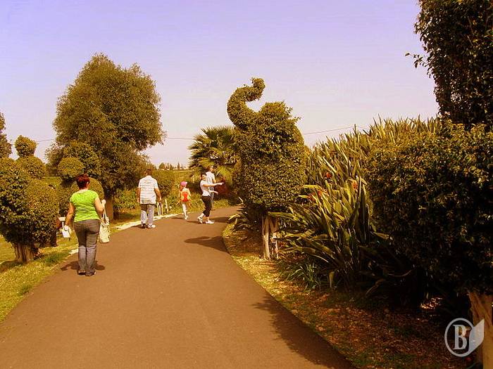 Вокруг оранжереи с тропическим микроклиматом - парк на открытой территории. Лабиринт, где стены кустарника выше человеческого роста и, признаться, страшновато, что не найдешь выход: высоко над головой небо, а вокруг зеленые толстые стены. Аллея с декоративно выстриженными кустарниками. Благоухающий луг лекарственных растений. Японский сад. Пруды. Цветники и оранжерея для бабочек.
