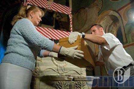 Науковий співробітник передає коробку з рештками Ярослава Мудрого директорові Національного заповідника Софія Київська Нелі Куковальській