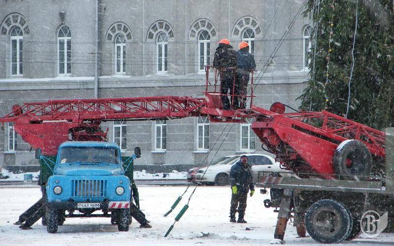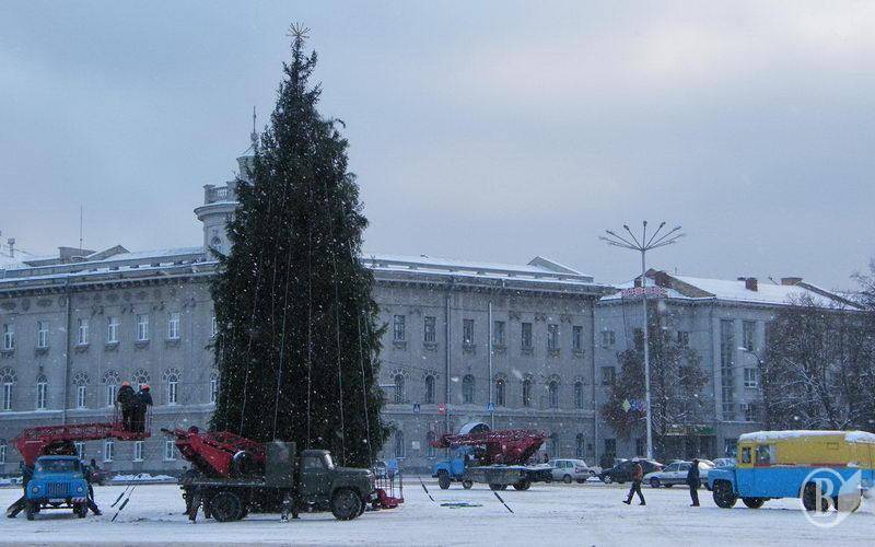 На Красной площади в Чернигове установлена новогодняя ёлка. На данное время многочисленные мрачные мужчины без лишней спешки «связывают» ее проводами.