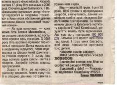 - Як нам пояснили, - каже мама віти Тетяна Миколаївна, - це страшне захворювання, що поступово вражає весь організм. З 2006 року віта постійно приймає гормональні препарати. Дочка мусила піти в академічну відпустку, потім перейти на філологічний факультет за станом здоров’я. У цьому році ледь встигла здати іспити і лягла в лікарню. Хвороба почала швико прогресувати. Зараз у Віти до основного діагнозу додалось безліч супутніх. А в лікарню дівчина потрапила з ураженням нирок.