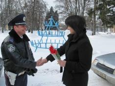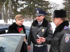 Работники Госавтоинспекции Черниговской области на дорогах города останавливали транспортные средства под управлением женщин–водителей, поздравляли с праздником и дарили цветы, сувениры с логотипами Госавтоинспекции.