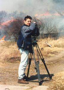 Березень, 2001 р. Тарас Процюк знімає на Банковій біля Адміністрації Президента. Фото Сергія Каразія