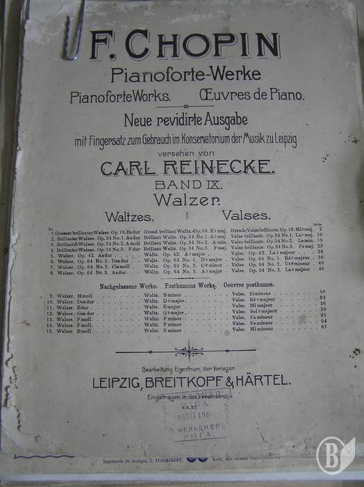 Серед зібрання нотних видань, таких як «Вальси Р.Бергера», «F.Chopin. Pianoforte-werke. Walzer», «Nouve lle danse de Salon. Valse», «Souis XV», «К.Т. Брумлер. Етюди», «Ala Bascule. Valse», «Carl Faust. Theresen-walzer» та інших, знаходились 7 старовинних документів та книга Гергарта Гауптмана 1908 року видання.