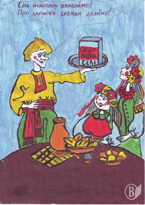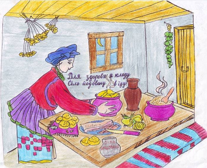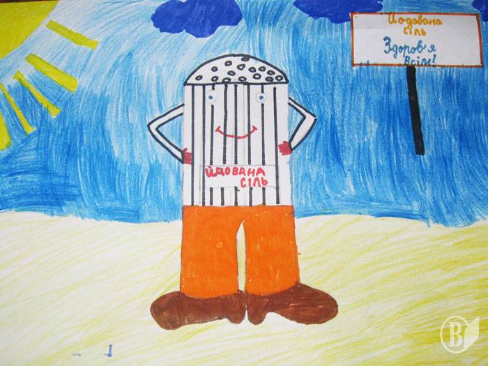 Інший школяр зобразив йодовану сіль у руках лікаря Айболитя. На ще одному малюнку – супергерой всередині пачки з йодованою сіллю. Він готовий прийти на допомогу. Або такий сюжет: мама місить тісто і використовує йодовану сіль.