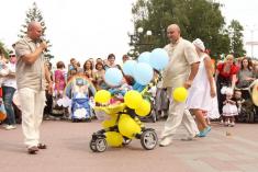 Один из малышей «прилетел» на этот праздник на вертолёте, другой – на самолетике, еще один – на беби-такси, несколько – на танках, в которые превратились их коляски благодаря родителям.