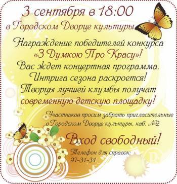 3 сентября в 18.00 в Городском Дворце культуры состоится награждение победителей конкурса «С Мыслью О Красоте»!