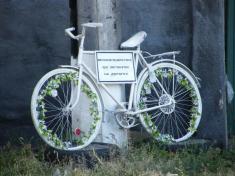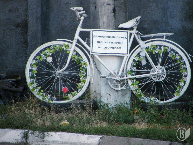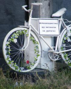 У Києві на вулиці Мельникова стоїть своєрідний пам’ятник загиблим на дорогах велосипедистам – прикутий на вічну стоянку шосейний велосипед, повністю пофарбований у біле.