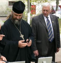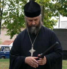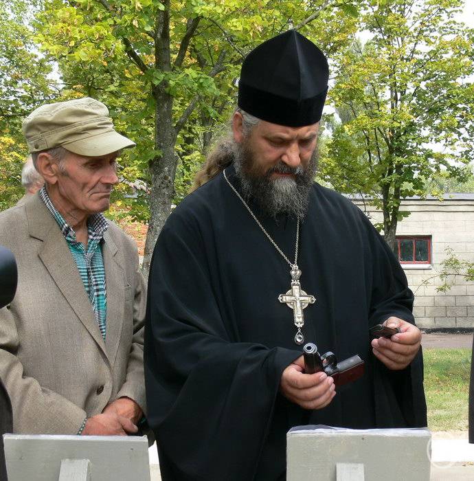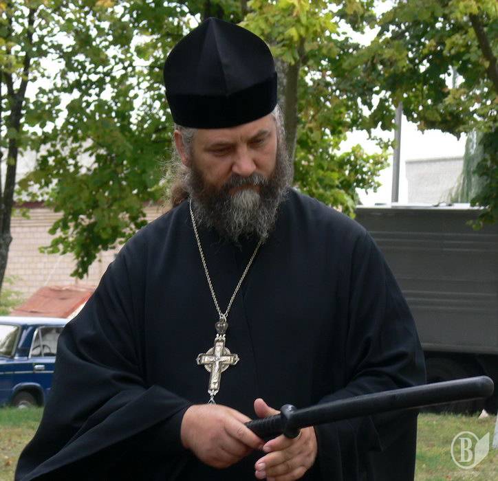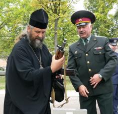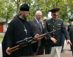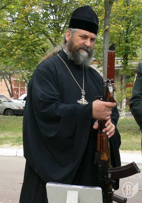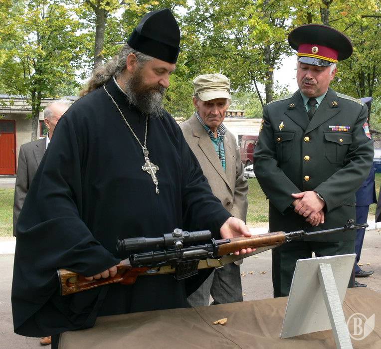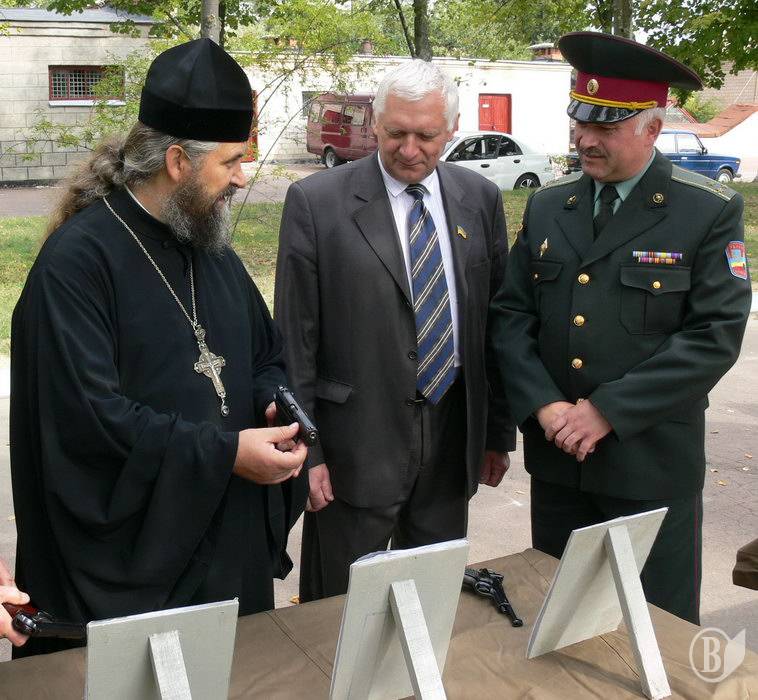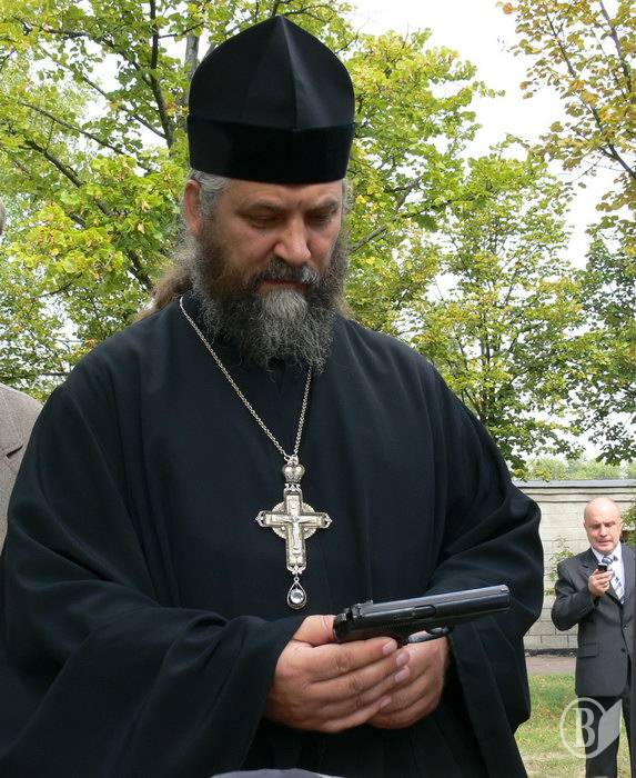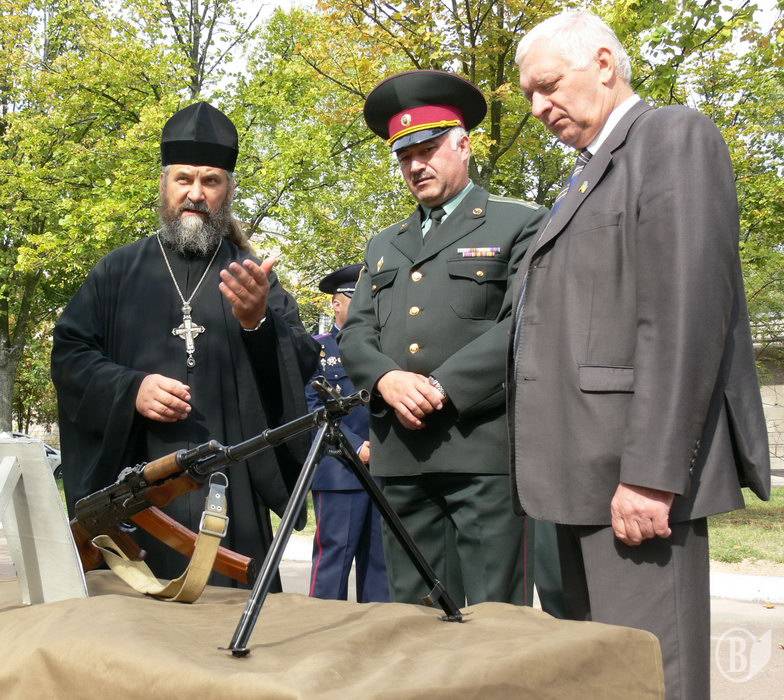 Во время отмечания 90-летия со дня создания батальона внутренних войск МВД Украины 3001 один из гостей – отец Федор – знакомился с образцами разного вида оружия.