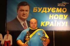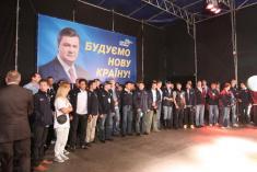 На сцені біля облмуздрамтеатру красувався великий портрет Януковича з його юлюбленим гаслом останнього часу "Будуємо нову країну".